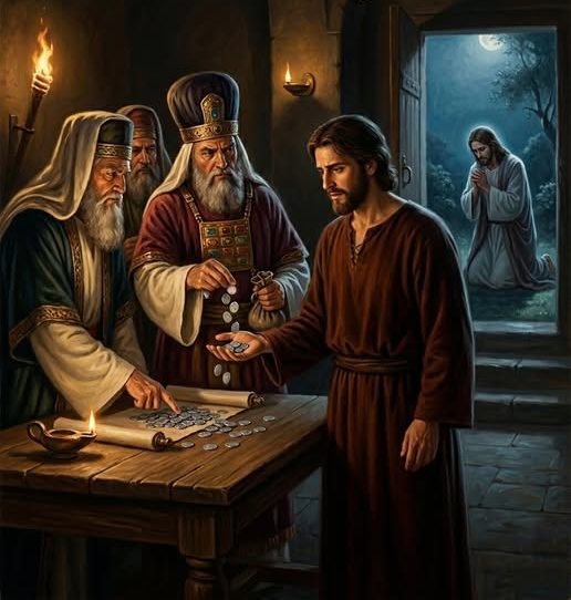 Judas Iscariote, uno de los discípulos más cercanos de Jesús, se reúne en secreto con los líderes religiosos para “conspirar” contra su Maestro. En un acto de traición y deslealtad según se cuenta, Judas acuerda entregar a Jesús a cambio de treinta monedas de plata, sembrando las semillas del dolor y la tragedia que culminarán en la crucifixión.
